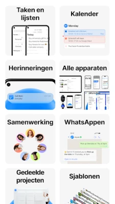 Any.do transformeert de manier waarop miljoenen mensen hun dagelijkse leven, projecten en doelen beheren. Deze veelgeprezen applicatie biedt een allesomvattende suite van tools die naadloos samenwerken: van een intelligente takenlijst en een intuïtieve dagplanner tot een geavanceerde kalender en handige herinneringen. Het is dé complete oplossing om uw taken te stroomlijnen, deadlines te halen en uiteindelijk meer rust in uw schema te creëren. Any.do is erkend als een essentiële assistent voor een georganiseerd en productief leven.