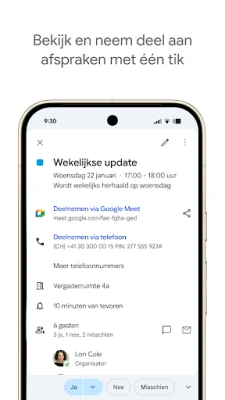 Als essentieel onderdeel van Google Workspace tilt Google Agenda teamwork naar een hoger niveau. Faciliteer productieve samenwerkingen door direct vanuit een agenda-afspraak een Google Meet-videogesprek te starten, ideaal voor hybride werkomgevingen. Plan moeiteloos vergaderingen door de beschikbaarheid van teamleden te controleren of meerdere agenda's over elkaar te leggen in een enkele weergave. Voeg belangrijke documenten, notulen of leesmateriaal toe aan elke afspraak, zodat iedereen voorbereid aan de slag kan. Bovendien biedt Google Agenda professionele boekingspagina's, waardoor het plannen van afspraken met klanten en patiënten aanzienlijk vereenvoudigd wordt, en u kunt zelfs uw werklocatie delen met collega's voor optimale coördinatie.