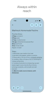 Uw ideeën zijn altijd binnen handbereik, waar u ook bent. Google Keep synchroniseert naadloos tussen uw telefoon, tablet, computer en Wear OS-apparaat, zodat al uw aantekeningen actueel zijn op al uw platformen. Optimaliseer uw workflow met slimme functies zoals locatiegebonden herinneringen; laat Google Keep u eraan herinneren uw boodschappenlijst te openen zodra u de supermarkt nadert. Voor directe toegang kunt u notities vastpinnen op het startscherm van uw mobiele apparaat of ze snel oproepen via handige widgets en Wear OS-tegels. Google Keep helpt u focussen op wat belangrijk is, op het juiste moment.