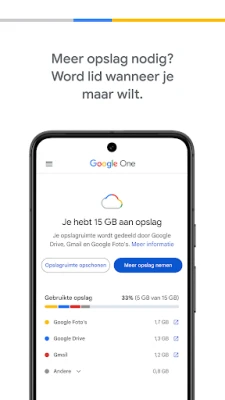 Voor gebruikers wiens digitale behoeften verder reiken dan de standaardcapaciteit, opent een Google One-lidmaatschap de deur naar uitgebreide mogelijkheden. Verhoog je opslagruimte aanzienlijk en creëer zo de vrijheid voor al je ambitieuze projecten, omvangrijke bestanden en een overvloed aan dierbare herinneringen. Kies uit een reeks flexibele abonnementen om de perfecte opslagoplossing te vinden die nauwgezet aansluit bij jouw specifieke vereisten en levensstijl.