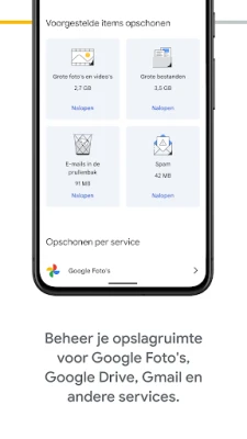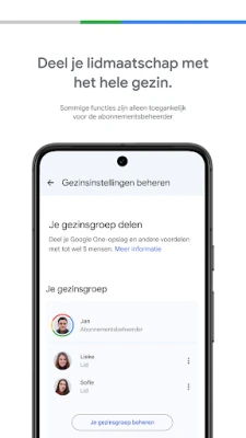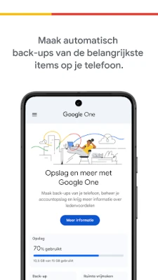 Met Google One beveilig je belangrijke gegevens door automatische telefoonback-ups te creëren. Beheer al je Google-cloudopslag eenvoudig en overzichtelijk op één centrale plek, zodat je altijd toegang hebt tot je bestanden.
