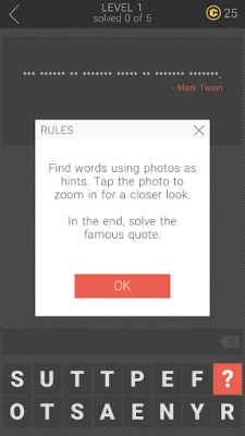 Ontrafel beroemde citaten en wijze spreekwoorden in deze verslavende hersenkraker. Los versleutelde woorden op met behulp van foto's als aanwijzingen. Hoe meer je oplost, hoe meer letters van het citaat verschijnen. Zoom in op de afbeeldingen voor details. Een uitdagende en vermakelijke puzzelervaring!