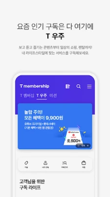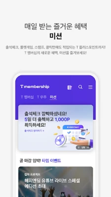 De voordelen van T 멤버십 reiken verder dan alleen keuzevrijheid. Neem deel aan boeiende missieprogramma's die het verzamelen van T Pluspunten tot een leuke en interactieve bezigheid maken. Denk hierbij aan dagelijkse aanwezigheidscontroles, spannende roulettespellen en het verzamelen van digitale stempels tijdens de 'voordelenreis'. Elk voltooid avontuur beloont u met waardevolle punten die u eenvoudig kunt inwisselen voor nog meer privileges. Bovendien introduceert T 멤버십 u in het dynamische T 우주-ecosysteem, waar u een selectie van abonnementsdiensten vindt die naadloos integreren met en aanvullen op uw unieke levensstijl.